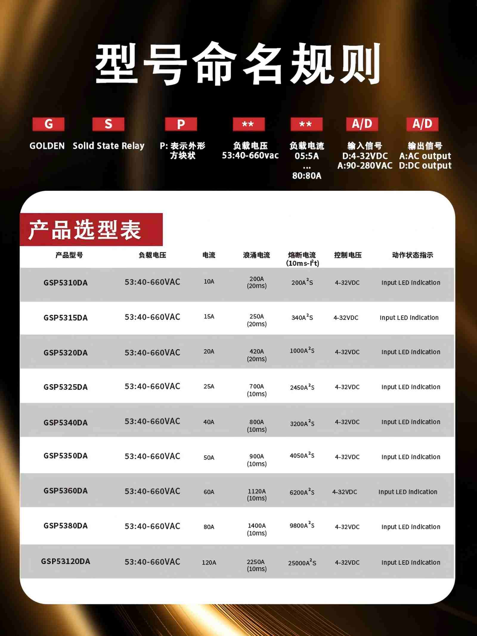 | GSP53120DA-2 | 53:40-660VAC | 120A | 4-32VDC | ≤2500VAC | ≥2500VAC | 输入LED灯指示 | 联系销售专员 |