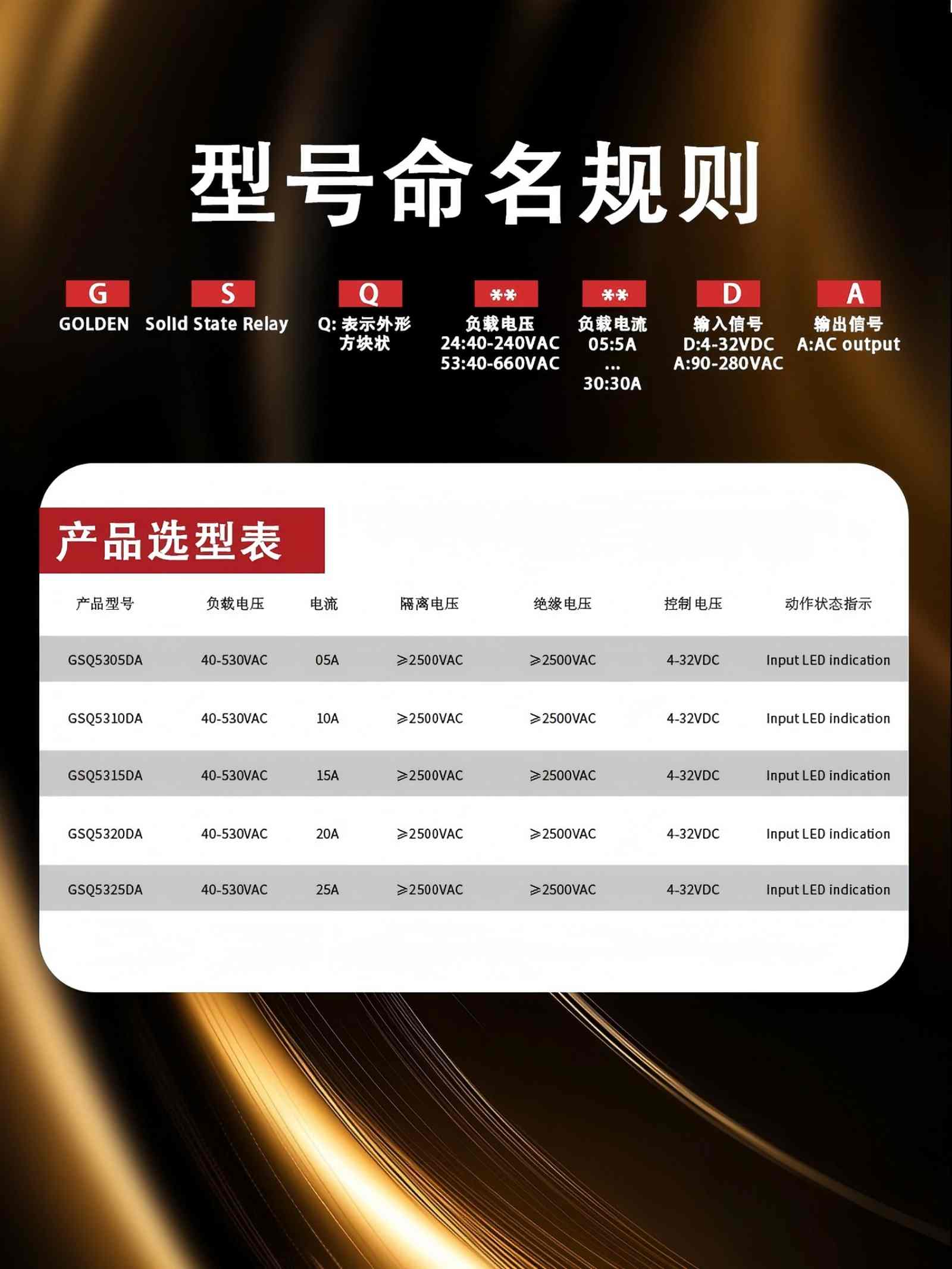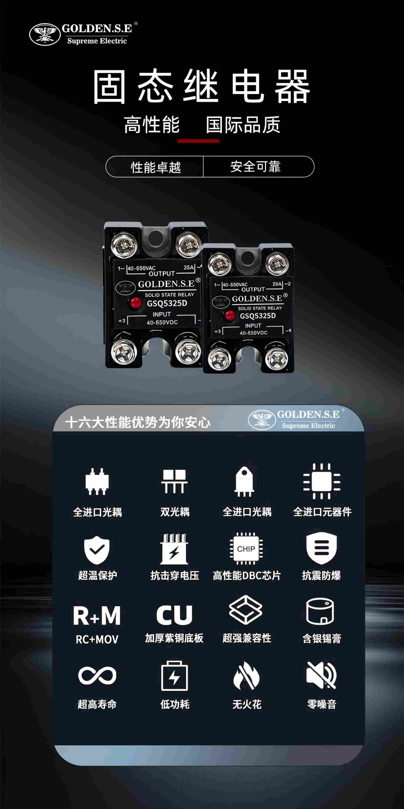 GSQ为面板安装型交流固态继电器。产品结构紧凑,体积小巧,节省面板空间。和标准方块形固态继电器相比,GSQ系列可以节省70%的空间。输入输出之间采用光电隔离,介质耐压达到。内置RC吸收回路,采用环氧树脂灌封。